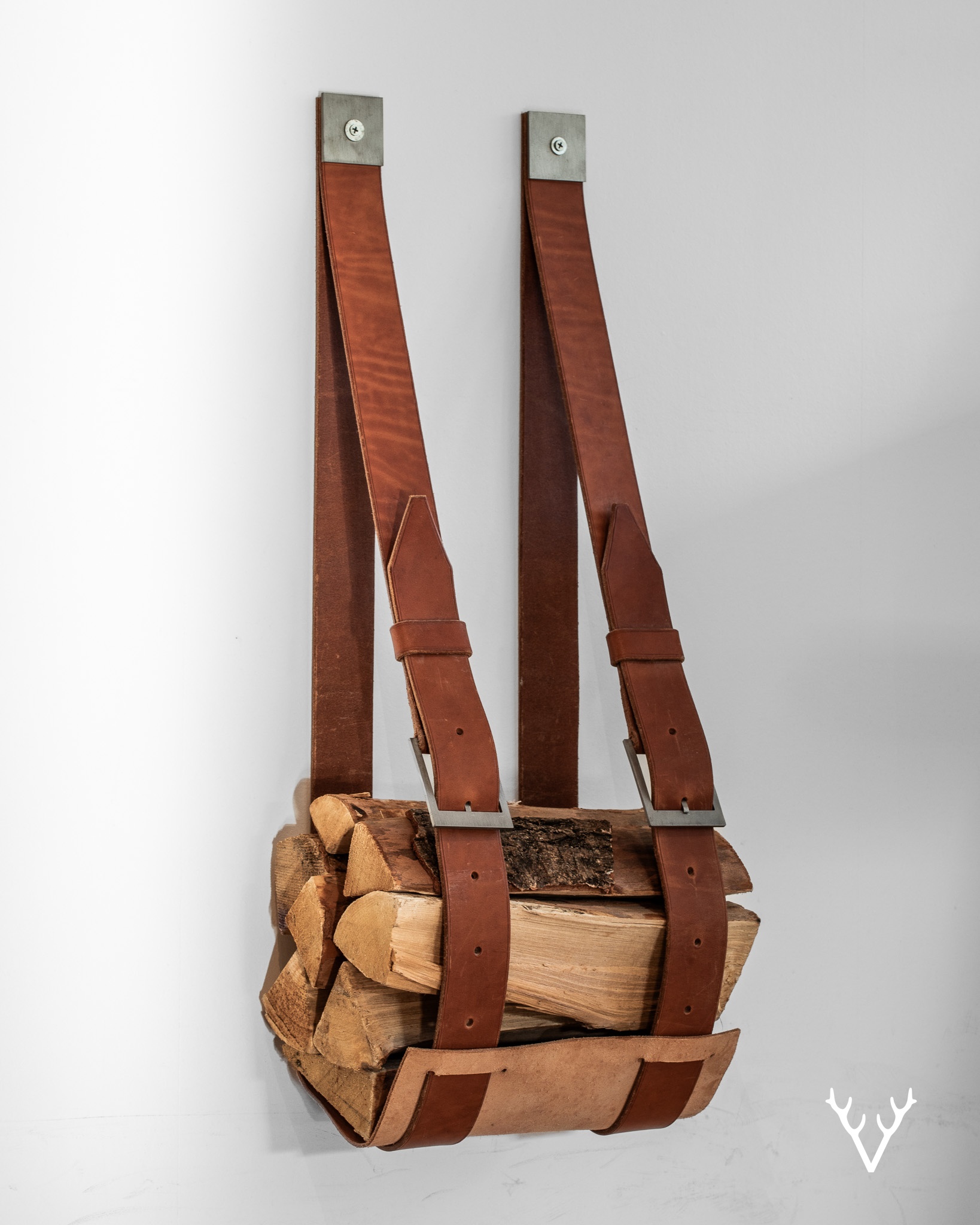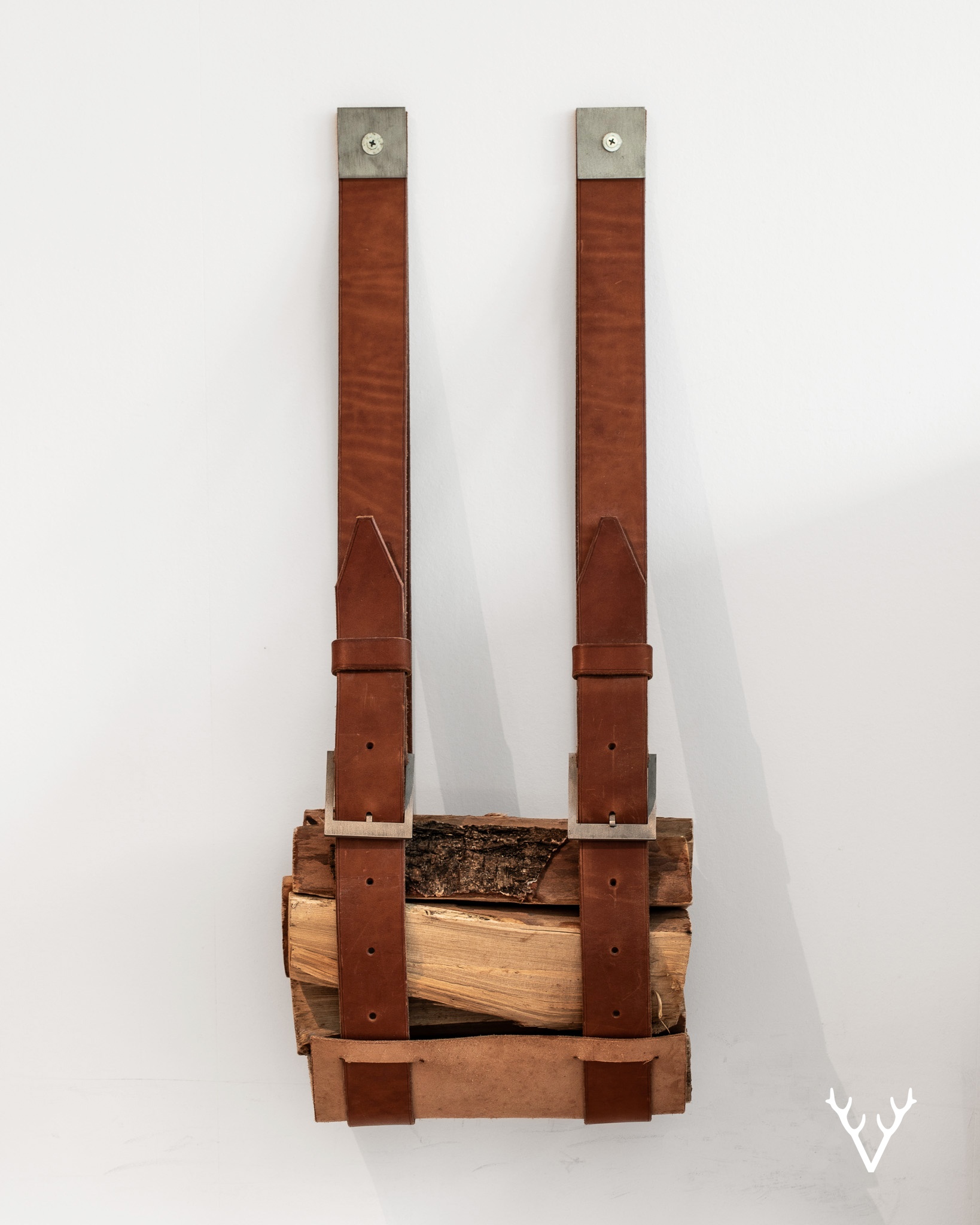 Handgjort i vegetabiliskt garvat läder och kombinerat med specialritade metalldetaljer balanserar objektet ärlighet i materialen med stillsam funktionalitet. Den flexibla och kraftfulla konstruktionen låter formen anpassa sig naturligt beroende på mängden ved.